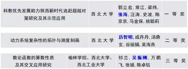 本次yl88858cc永利官网主持和参与的成果共有17项获奖,yl88858cc永利官网主持及参与完成的3项科技成果获奖。其中,yl88858cc永利官网张海教授参与的项目“科教优先发展助力陕西新时代追赶超越对策研究及其示范应用”,荣获一等奖;历智明教授主持的项目“动力系统复杂性的拓扑与测度刻画”,荣获二等奖;吴振刚副教授参与的项目“数论函数的算数性质及其交叉应用研究”,荣获三等奖。
