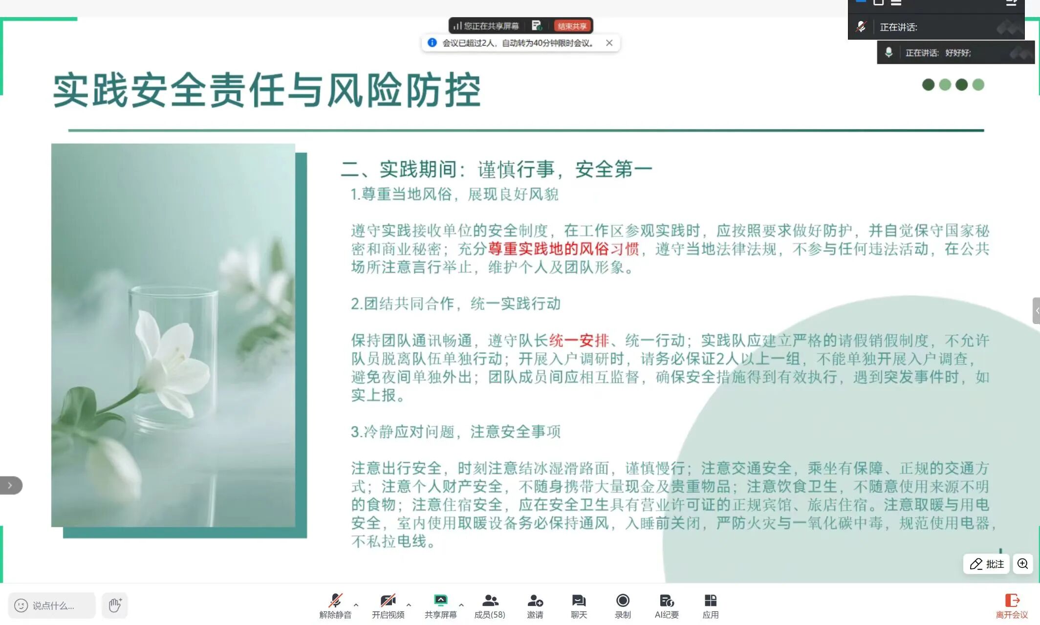 团委科创部朱俊豪同学进一步细化叮嘱:出行选正规交通工具、出行结伴报备,保管贵重物品防诈骗,严守实践操作规范;并明确意外处置流程,为寒假实践筑牢安全防线。