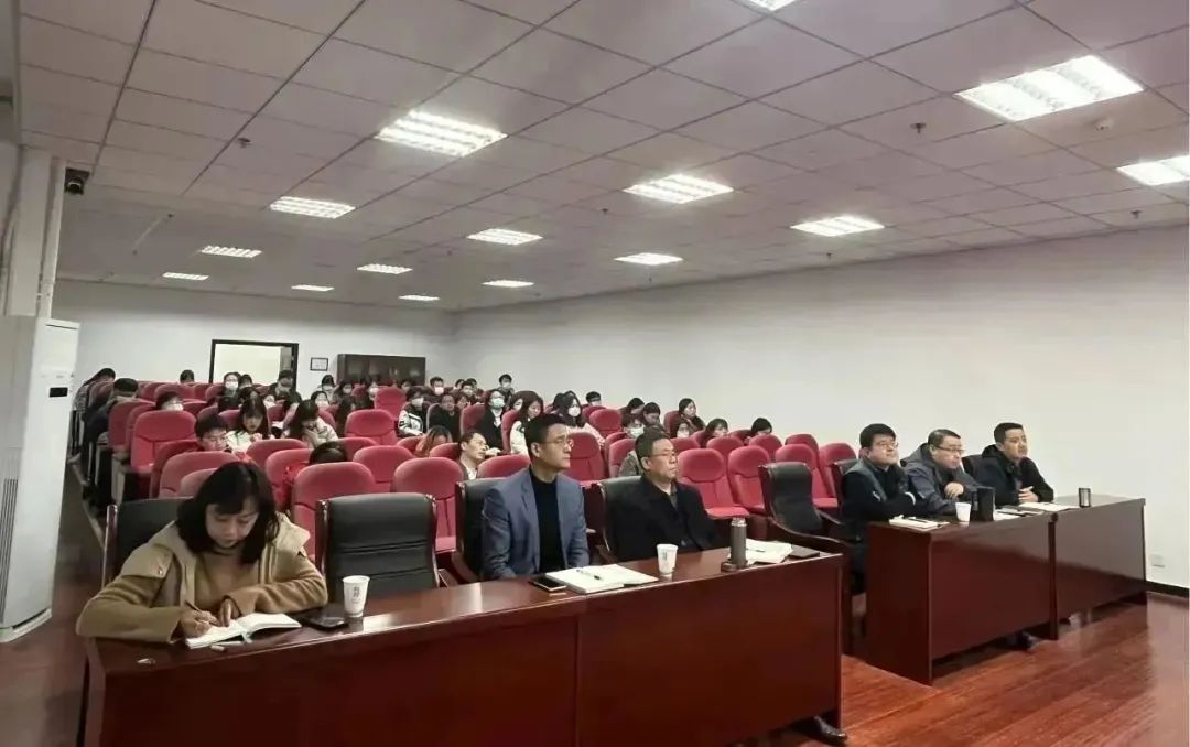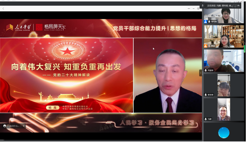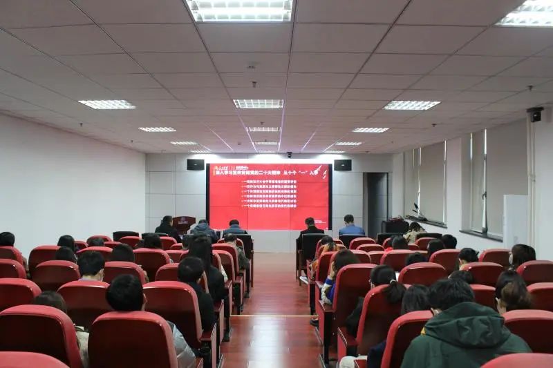 11月21日下午,yl88858cc永利官网党委组织全院师生观看学习由中国发展改革报社副社长、中央广播电视总台特约评论员杨禹主讲的“党的二十大精神解读”专题学习。学院党政班子成员、各支部书记、师生党员代表集体在学院凌岭报告厅收看学习,各支部组织师生党员通过线上线下方式集中学习。