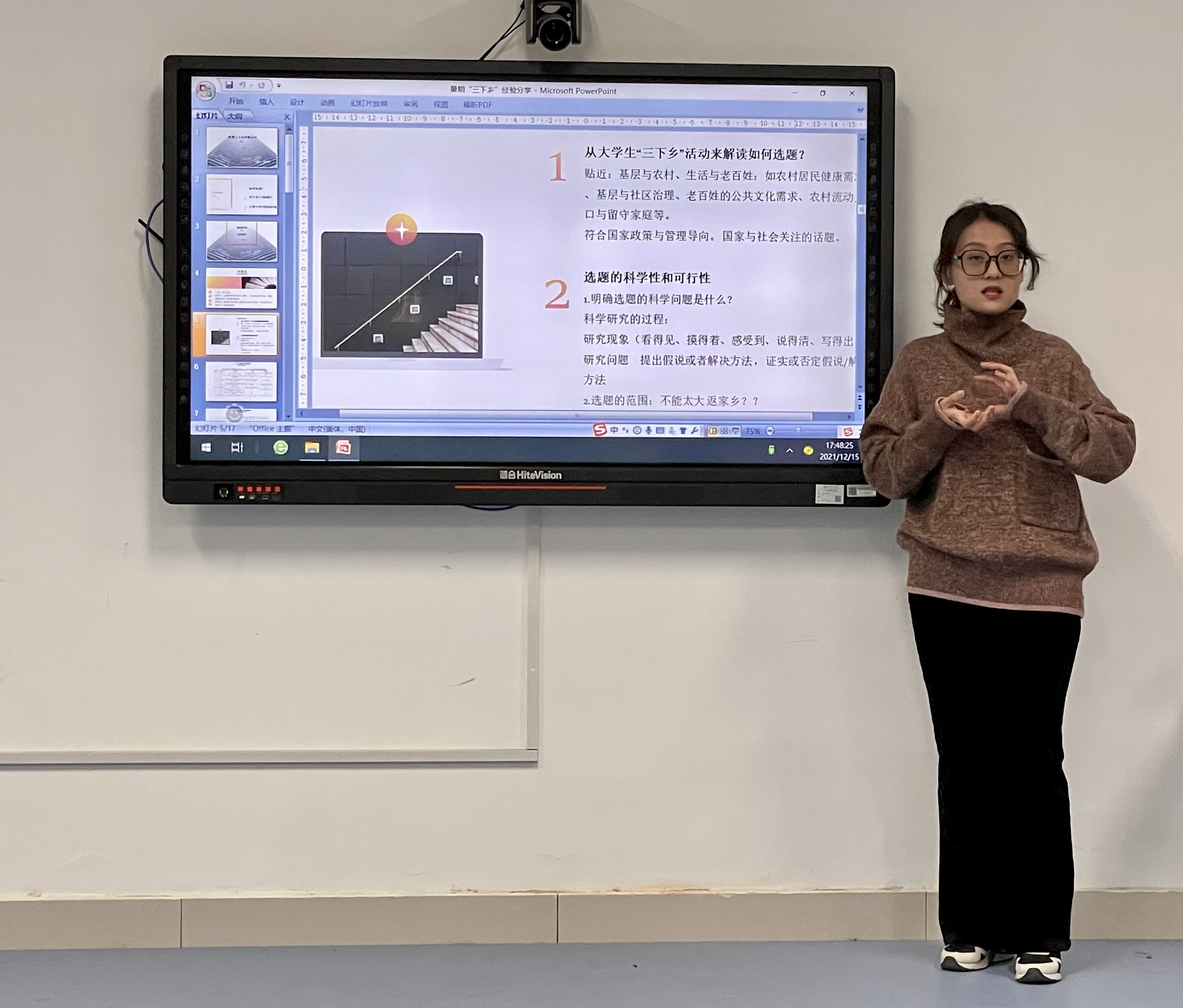 文学院2020级硕士范旭颖同学,以实践活动经验的分享为主,她分别从如何选题、项目计划书的撰写以及实践过程中的注意事项出发,强调选题一定要由点及面,以小见大,要以服务基层、造福社会为宗旨。并建议同学们在实践过程中,多收集素材、多拓宽思路,并及时进行总结,为即将要开展寒假实践的同学们打开了思路。