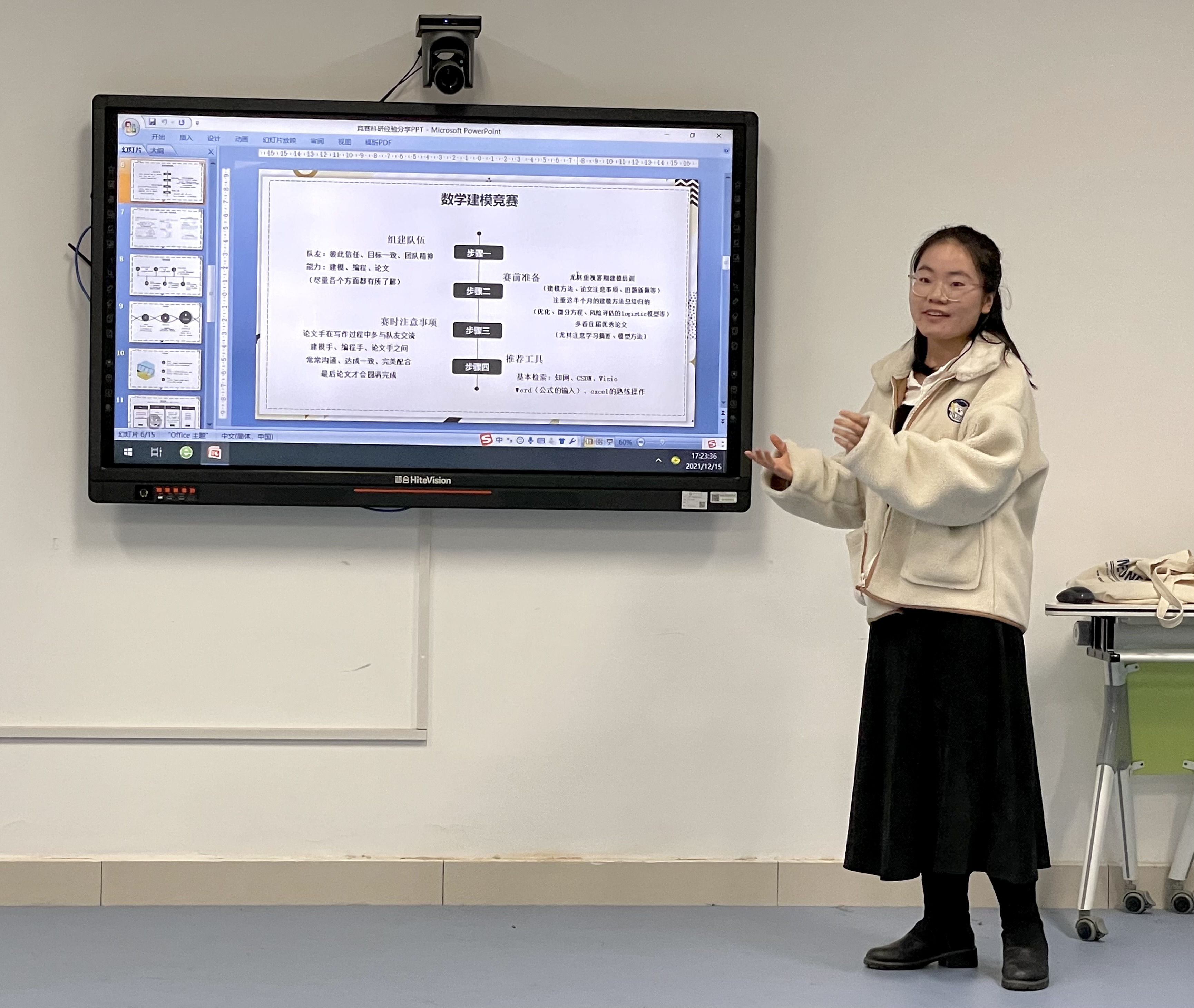 2019级数学与应用数学专业本科生强嘉仪同学,分别从建模竞赛、大学生创新创业竞赛以及数学竞赛这三个项目出发,主要针对建模流程及注意事项、大创项目的准备工作、数学竞赛的备赛经验三个方面进行了详细的介绍和分享,她建议同学们应该在赛中学、多归纳总结,并在最后鼓励大家勇于迈出第一步、告诫同学们在比赛过程中要保持恒心和毅力、重在参与和学习!