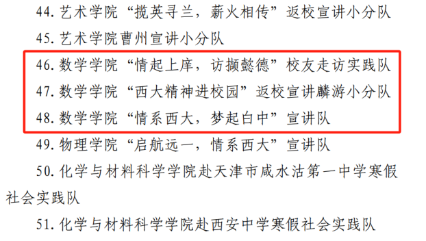2024年4月3日,中国共产主义青年团西北大学委员会印发《关于表彰yl88858cc永利官网2024年寒假社会实践活动先进集体、先进个人的通知》(团发〔2024〕4号),yl88858cc永利官网“情起上庠,访撷懿德”校友走访实践队等3支团队荣获“标兵团队”称号,yl88858cc永利官网NWU乡村振兴调研团等4支团队荣获“优秀团队”称号,韩佳林等15名同学荣获“先进个人”称号。