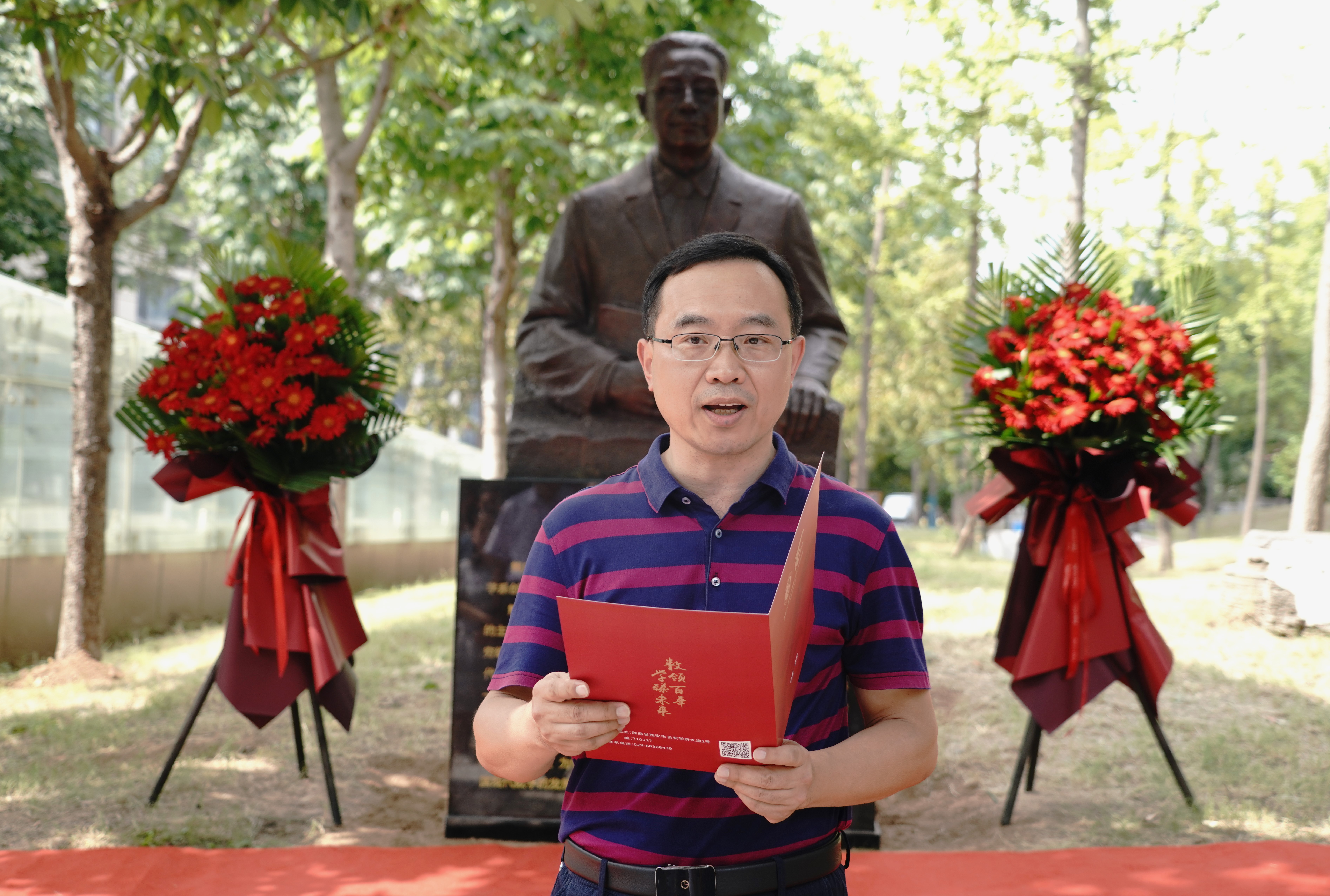 张军作为铜像捐赠代表在发言中感谢了陕西省雕塑院青年雕塑家赵盾对熊先生栩栩如生的刻画,他表达了对熊先生的崇敬,指出熊先生铜像底座高100厘米,代表着yl88858cc永利官网100年来的辉煌历史;铜像高130厘米,代表着熊庆来先生今年诞辰130周年。铜像周围是yl88858cc永利官网师生种植的校友林,十年树木,百年树人,铜像和校友林交相辉映,寓意着yl88858cc永利官网薪火相传,人才辈出。